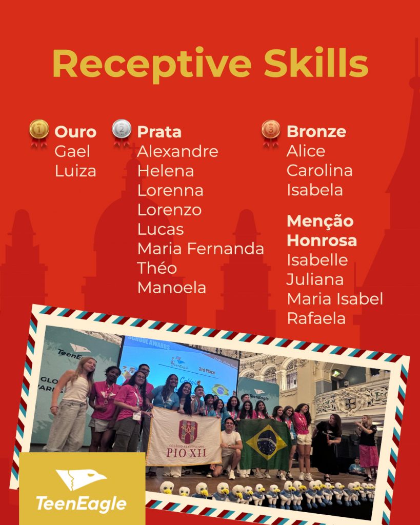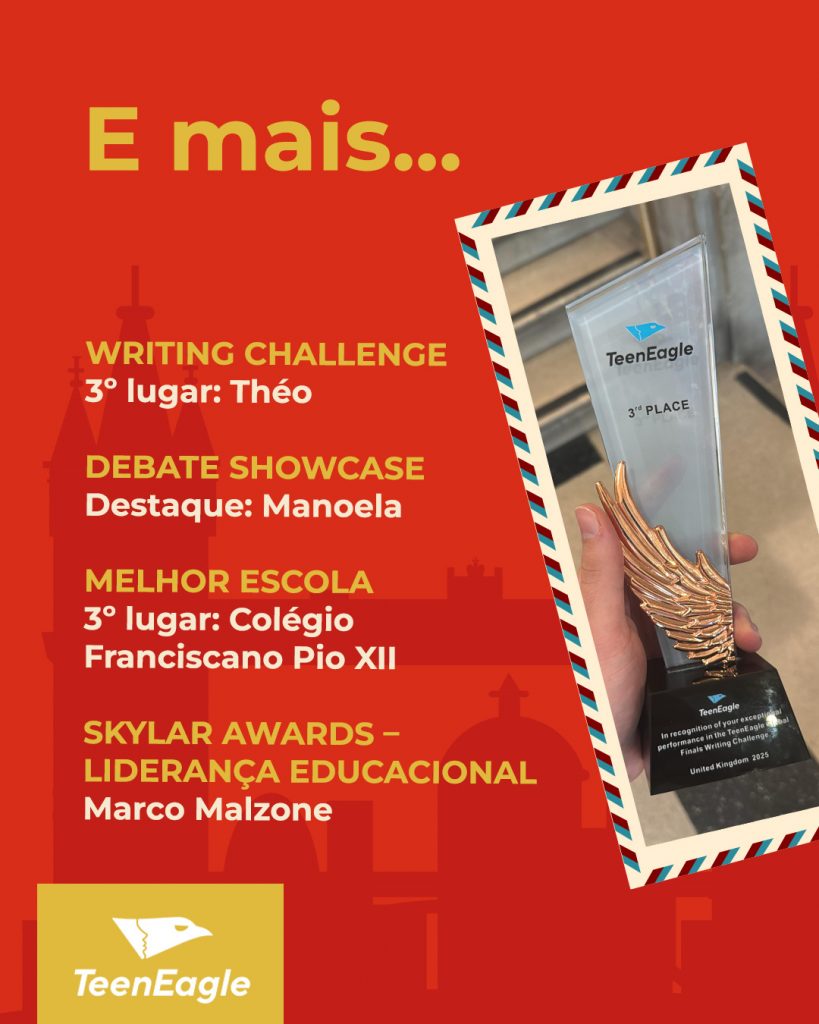 A TeenEagle é uma olimpíada acadêmica de fluência em inglês. A prova online foi realizada em fevereiro e os alunos medalhistas foram convidados para participar da fase global, em Londres, que aconteceu de 22 a 29 de junho. Os desafios envolveram debate, spelling bee, escrita e leitura na língua inglesa. Além dos desafios da competição, os estudantes exploraram pontos icônicos de Londres, como Oxford, British Museum, River Thames, London Eye, Big Ben, Buckingham Palace e os estúdios da Warner Bros – Harry Potter.